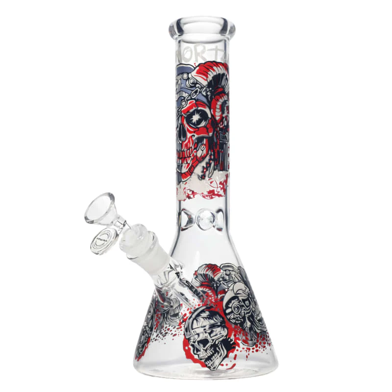 The 10" 4mm Arsenal Skull Syndicate Beaker delivers bold gothic artwork paired with dependable everyday performance. Featuring detailed skull-themed graphics wrapped around the neck and base, this piece brings a dark, edgy aesthetic while maintaining a clean and classic beaker silhouette. The high-contrast artwork and strong color accents give it powerful shelf presence, making it a standout option for customers who prefer aggressive, statement-driven designs. Constructed from durable 4mm glass, the Skull Syndicate Beaker is built for smooth airflow and consistent water filtration in a compact, easy-to-handle size. The stable beaker base ensures solid balance during use, while the open chamber design allows effortless pulls and easy cleaning. Ideal for customers looking for bold visual impact without compromising on functionality.