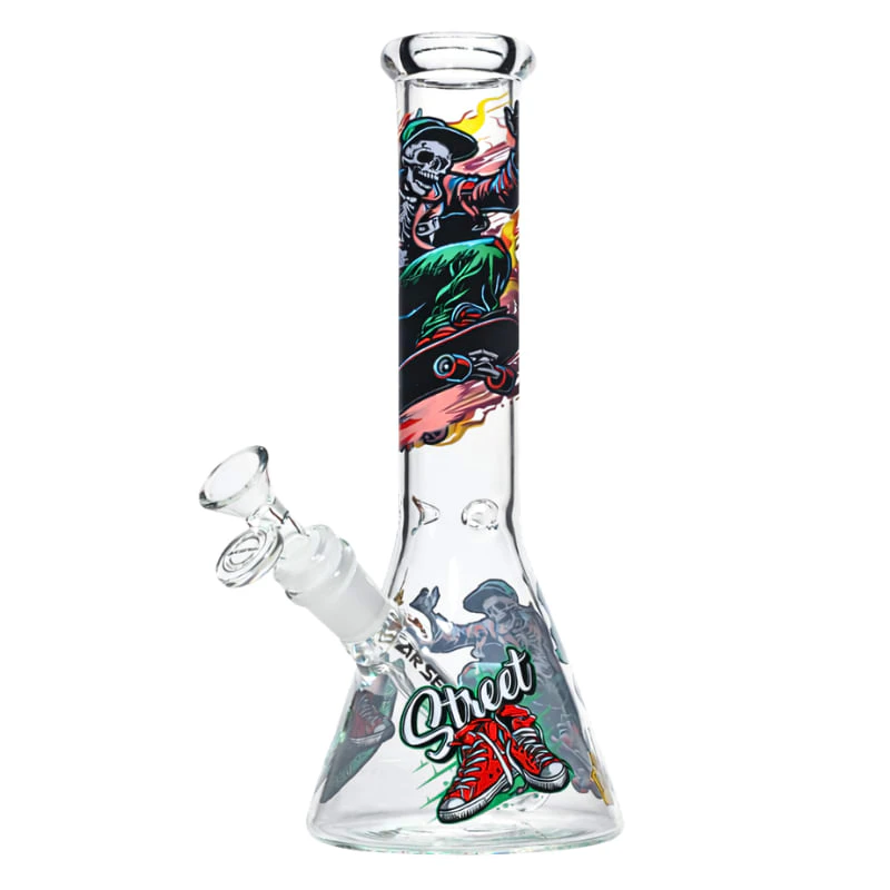 The 10" 4mm Arsenal Street Ink Beaker brings bold graphic artwork and urban-inspired visuals together in a clean, functional design. Featuring detailed street-style illustrations wrapped around the neck and base, this piece delivers edgy character while maintaining a classic beaker silhouette. The high-contrast artwork pops against the clear glass body, giving it strong shelf presence without overwhelming the overall profile. Constructed from durable 4mm glass, the Street Ink Beaker is designed for smooth airflow and dependable daily performance. The stable beaker base provides solid balance during use, while the open chamber promotes easy pulls and simple cleaning. Ideal for customers looking for expressive, graphic-driven glass that still performs reliably session after session.